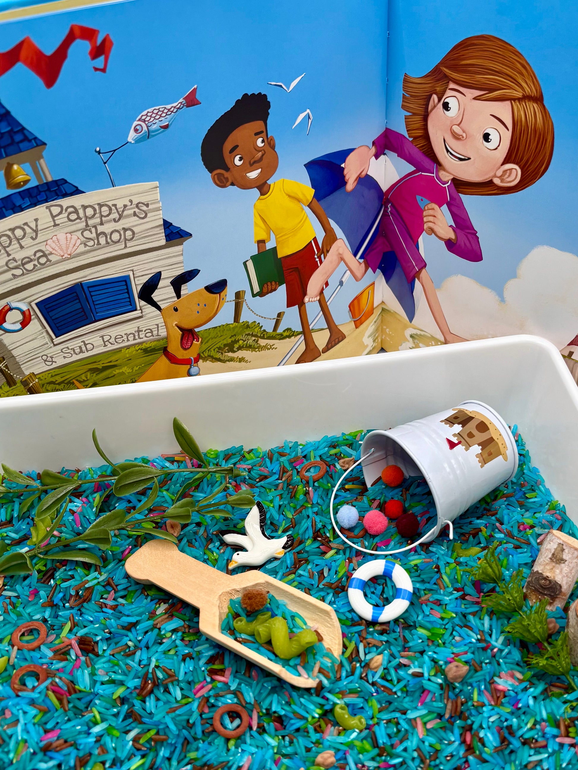 Dive into sensory fun with this magical, story-inspired bin! Includes a sparkling rice blend, crown, crabs, shark, pirate chest, gold coins, and a seagull—perfect for retelling the adventure or creating your own mermaid tale. Encourages fine motor skills, storytelling, and imaginative play.