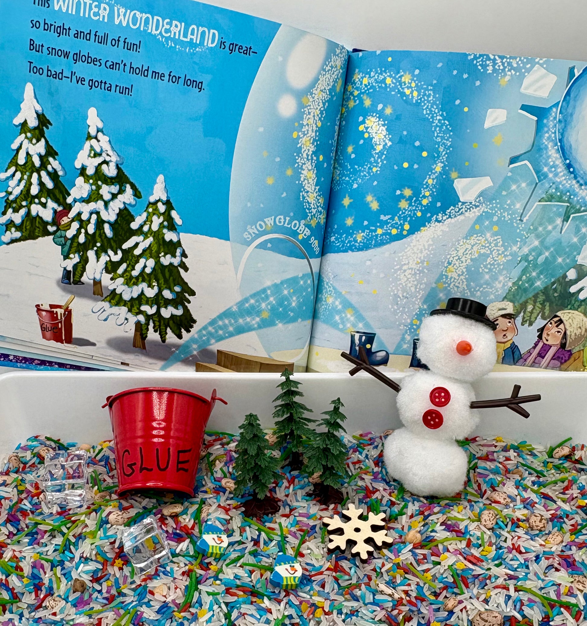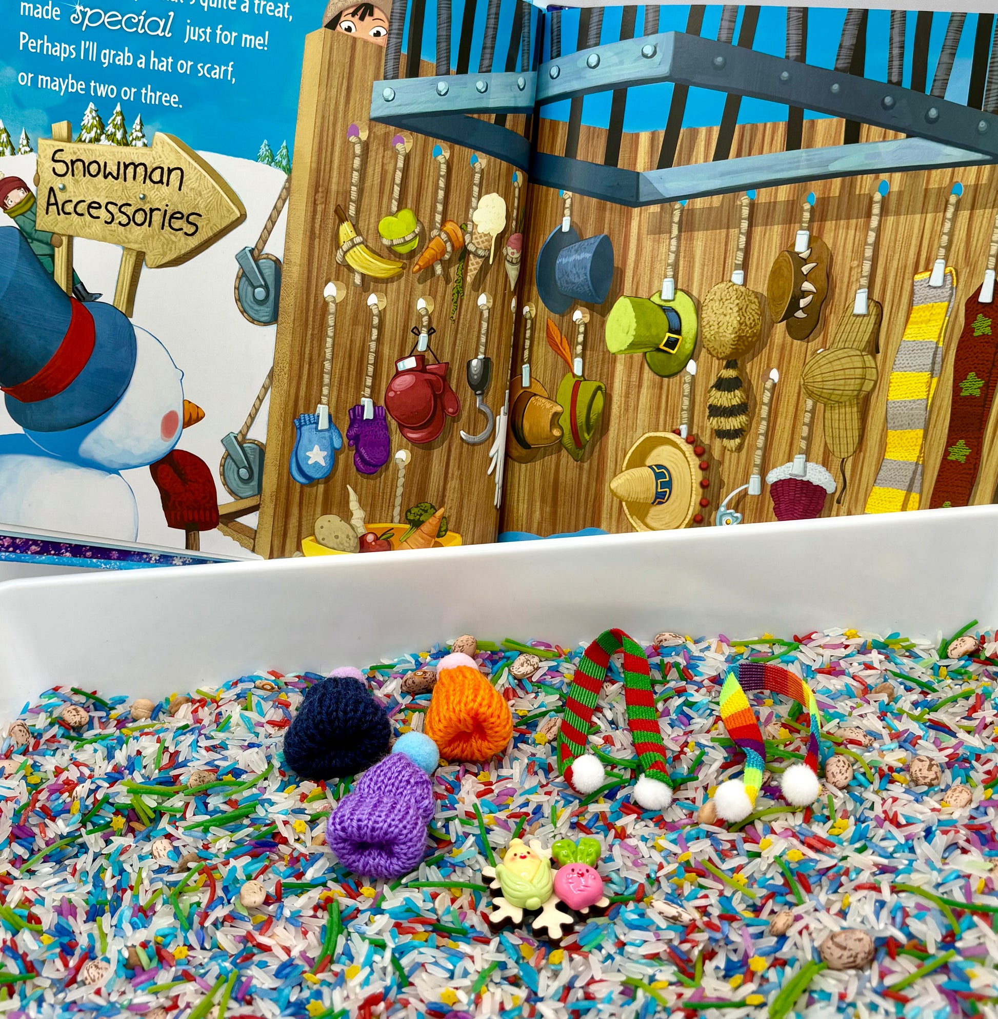 A frosty, hands-on adventure inspired by the wintertime story! This bin includes a snowman figure, winter-themed rice blend, sled, trophy, scarves, toques, and other story elements that let kids imagine their own snowman chase. Great for fine motor skills, sensory exploration, and creative storytelling.